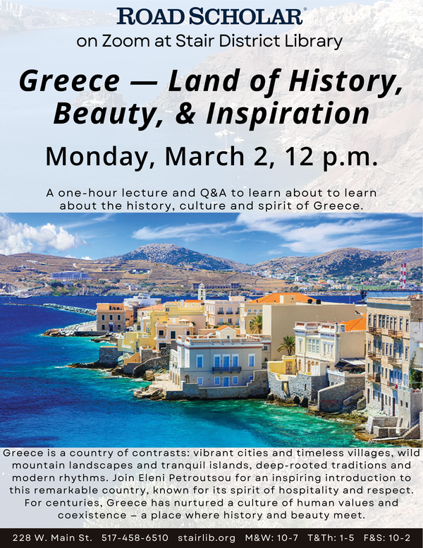 ROAD SCHOLAR, LIVE ON ZOOM @ THE LIBRARY, Monday, March 2, 12 p.m.: Greece -- Land of History, Beauty, & Inspiration!