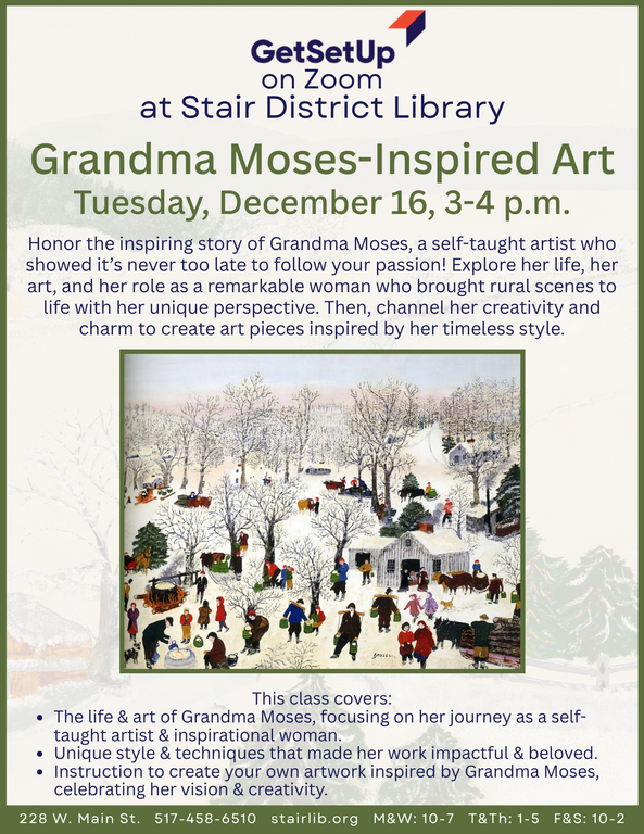 GETSETUP ON ZOOM @ THE LIBRARY: Grandma Moses-Inspired Art! Tuesday, Dec. 16, 3-4 p.m.
