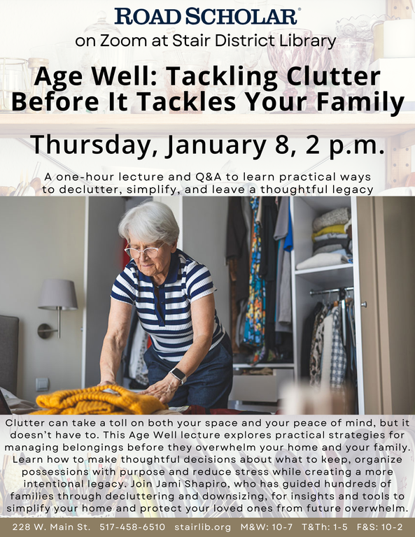 ROAD SCHOLAR, LIVE ON ZOOM @ THE LIBRARY, Thursday, Jan. 8, 2 p.m. Tackling Clutter Before It Tackles Your Family